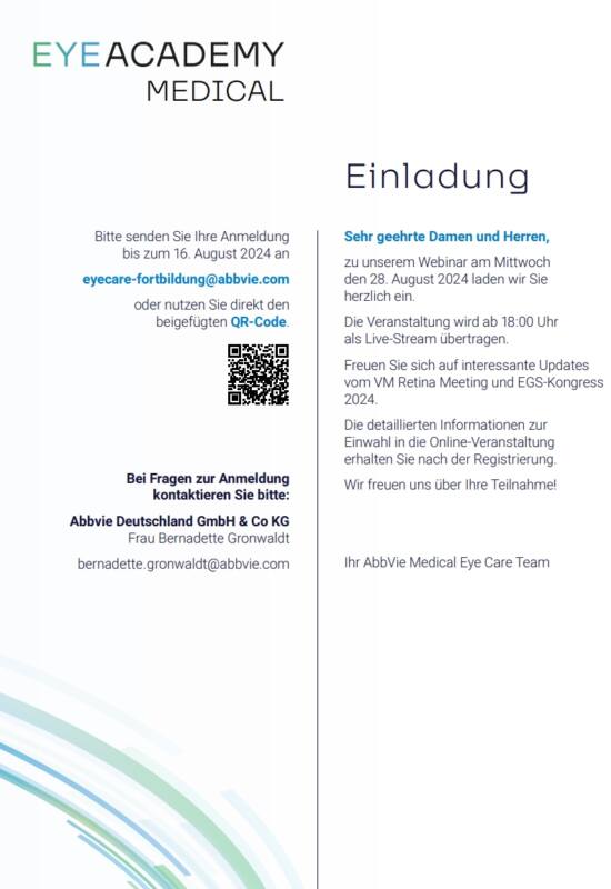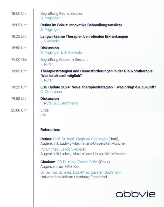 Am 28.08.24 von 18:00-20:00 Uhr findet die Online Veranstaltung „Augen auf die Zukunft – Schlüsselerkenntnisse zu Retina & Glaukom“ von der Firma AbbVie statt. PD Dr. F. Rüfer hat dort den Vorsitz und hält einen Vortrag zum Thema „Therapiestrategien und Herausforderungen in der Glaukomtherapie: Was ist aktuell möglich?“